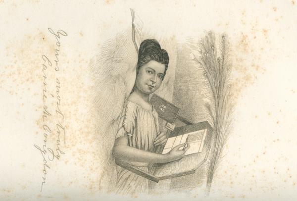 Waist-length recumbent portrait of the writer, holding a pencil at an invalid's writing desk, with books nearby. Peacock feathers along top of image.