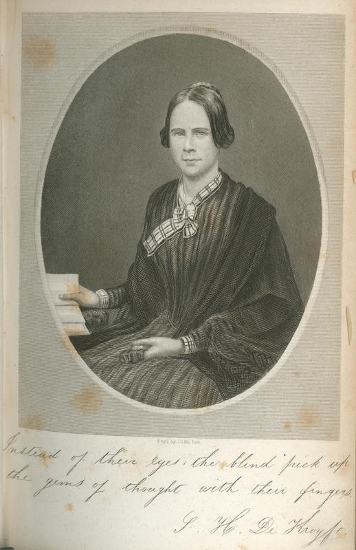 Facsimile inscription: Instead of their eyes; the blind pick up the gems of thought with their fingers. S.H. De Kroyft.