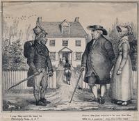 Racist caricature simultaneously mocking and condoning the pretentiousness and bigotry of early 19th century Philadelphia