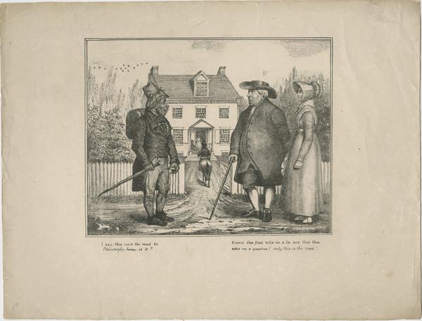 Quakers toward their "social inferiors." On a Philadelphia road in front of a small home with an open picket fence and a visitor
