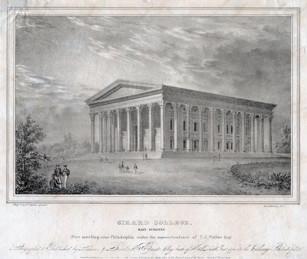 View of Founder's Hall, Girard College based on designs by Philadelphia architect Thomas Ustick Walter, issued separately as a souvenir of the building while it was still under construction. Constructed 1833-1847, the hall occupied a site between what became Girard Avenue and Ridge Avenues at Corinthian Avenue. Girard College was established through a bequest from Stephen Girard, a Philadelphia financier and philanthropist, for the creation of a school for poor white male orphans.