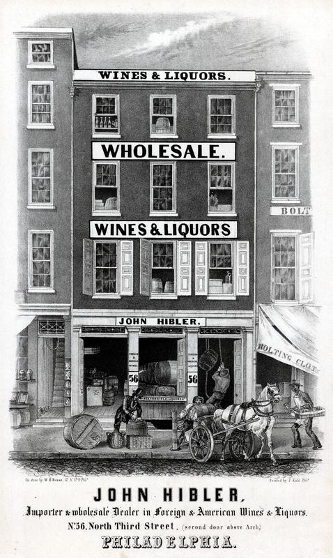 Advertisement depicting the four-story shop containing signage advertising wines & liquors. The doors, windows, and cellar are open for business. Inside the shop, wine casks, crates, jugs, and bottles line the floors and a laborer raises a cask with a pulley. Outside, a laborer loads casks onto a horse-drawn cart as nearby. An African American peddler with a basket and ringing a bell passes by. Partial views of the adjacent stores, possibly an apothecary and bolting cloth business, are visible. Hibler, operated the wine business at the location from 1840 until 1844, where afterward he operated a grocery.