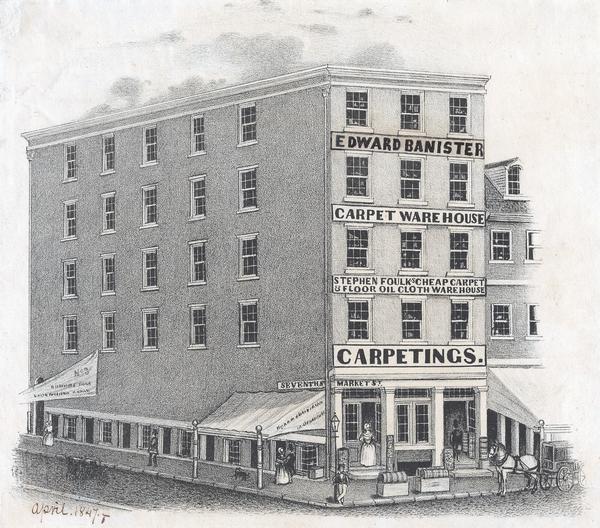 [Edward Banister carpet warehouse and Stephen Foulk's cheap carpet & floor oil cloth warehouse, corner of Seventh and Market Streets, Philadelphia] [graphic].