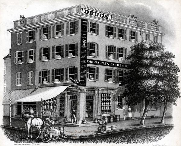 [John Horn, drugs and chemical store, N.E. corner of Third & Brown Streets, Philadelphia] [graphic] / Drawn on stone by W. H. Rease, 17 1/2 S. 5th. St.