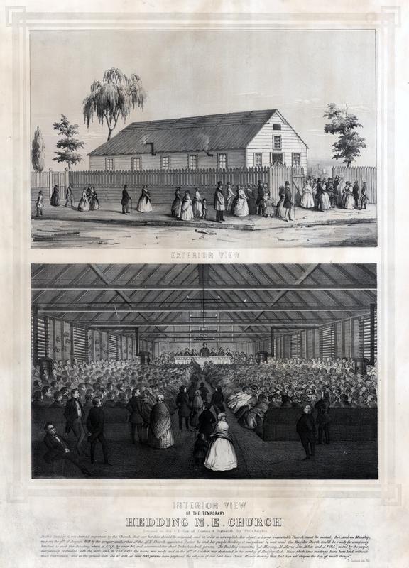 Exterior view [and] interior view of the temporary Hedding M. E. Church. Situated on the S.E. corner of Coates and Sixteenth Sts. Philadelphia. [graphic].