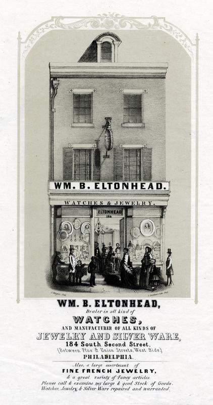 Wm. B. Eltonhead, dealer in all kinds of watches, and manufacturer of all kinds of jewelry and silver ware, 184 South Second Street, (between Pine & Union Streets, west side,) Philadelphia. [graphic] / J. Magee, Del.