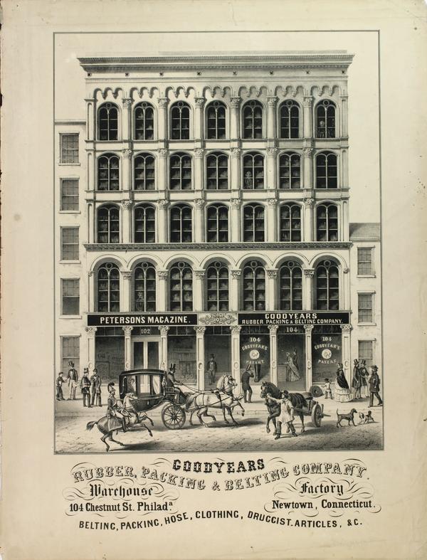Goodyears Rubber-Packing & Belting Company. Warehouse 104 Chestnut St. Philada. Factory Newtown, Connecticut. Belting, packing, hose, clothing, druggist-articles, etc. [graphic].
