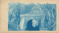 Depicts a small stream running through a stone culvert under the railroad tracks.
