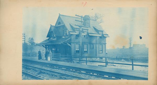 View of a two-story railroad station. Four women, a man, and a child stand on the platform near the railroad tracks. For views