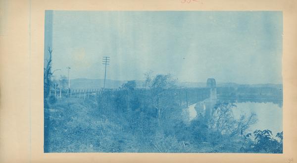 Depicts the timber Howe truss bridge spanning the Susquehanna River between Havre de Grace and Perryville, Maryland. The bridge
