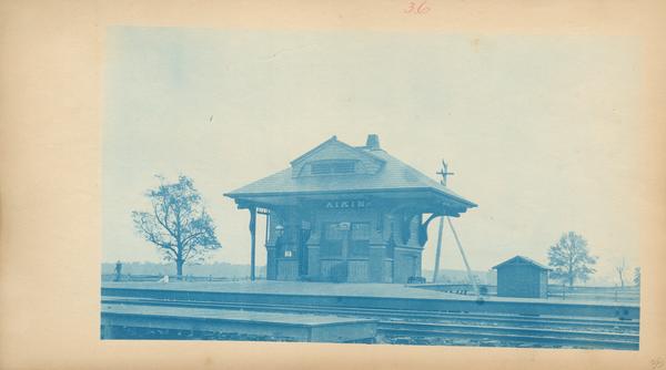 Depicts a small, one room railroad station. For similar station designs see Harford Station (P.9945.21); Baldwin Station (P.9945.51);