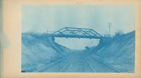 Depicts the Mechanicks Valley Road bridge spanning the railroad tracks. Men stand on a platform in the distance.