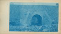 Depicts a large stone culvert under the railroad tracks.