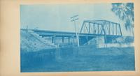 Depicts a railroad bridge with both a deck plate girder and through truss design.