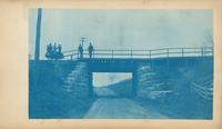 Depicts a girder bridge spanning Telegraph Road. Several men stand in the hand cart on the tracks. Two men lean against the