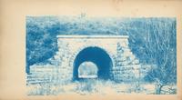 Depicts a large, single stone culvert under the railroad tracks.