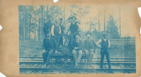 Group on the Hand Cart Taken at Stony Run, Section #10 Whitaker Station, Foreman P.G. McNamee [including] 1. Geo. W. Andrews, F of B & B 2. Dr. Robb, Medical Examiner 3. Wm. A. Pratt, Div Engr M of W 4. P.G. McNamee, Foreman.