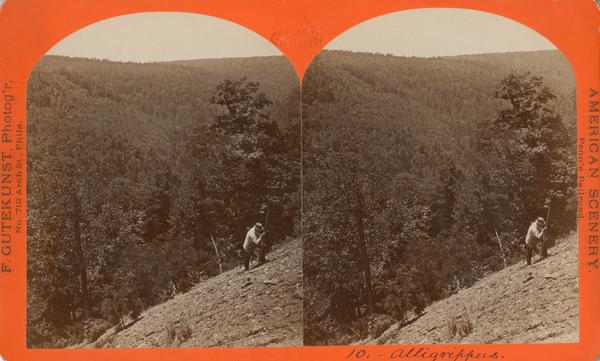 Depicts a man standing on the steep slope near the Allegrippus, a gorge near the Horseshoe Curve in the Allegheny Mountains,