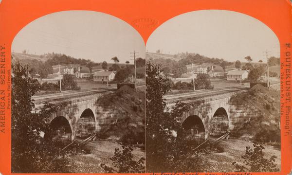 View of a stone, double arch bridge carrying railroad tracks over Turtle Creek near Stewart's Station. A house and a church are visible in the distance.