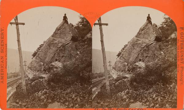 Depicts a man sitting on a tall boulder near the railroad tracks in the Pack Saddle, which is a deep gorge that runs through