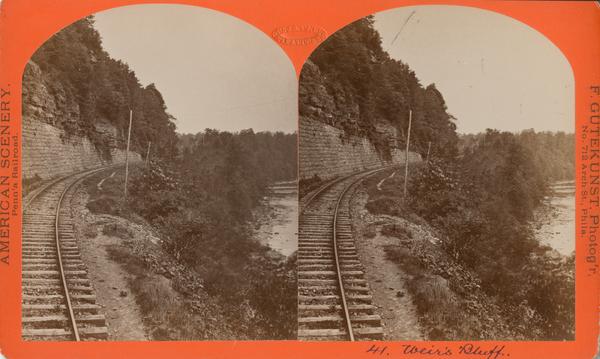 Depicts a single railroad track sandwiched between a rock wall and Weir's Run. |