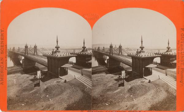 Depicts the elegant wire-suspension bridge spanning the Allegheny River in Pittsburgh, designed by John A. Roebling, constructed 1857-59, and replaced in 1892. Known as the Sixth Street Bridge and the St. Clair Bridge.
