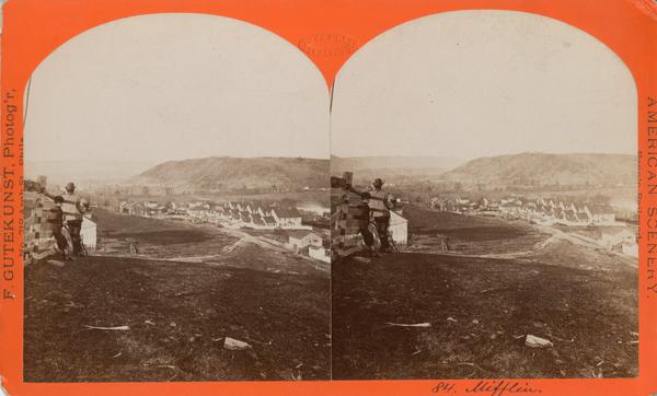 Depicts a man and a boy looking down from a hill at a cluster of dwellings in Mifflin, Pa. |