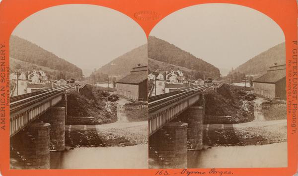 Depicts the railroad tracks near a forge in Tyrone, a stop on the Tyrone and Clearfield Branch of the Pennsylvania Railroad.