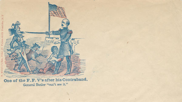 Image: A runaway grasps General Benjamin Butler for protection as his former owner approaches. Butler's sword is drawn and pointing at the slave owner, who is from one of the first families of Virginia. The slave owner is portrayed as a scarecrow holding a dog leash in one hand and a cat-o'-nine-tails in the other. Scene takes place in front of Fort Monroe. Refers to the contraband policy that banned soldiers from returning runaway slaves to their owners once they crossed Union lines.