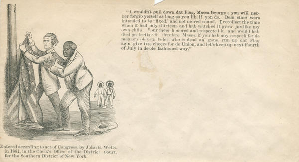 Image: A shocked African American man tries to stop Massa George, possibly meant to be George Washington's (non-existent) son, from pulling down the Union flag. Two African American men stand in the background.