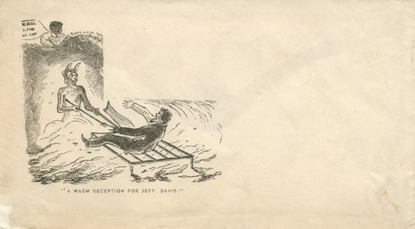 Image: A grinning devil figure rakes Jefferson Davis over the coals. An African American man watches the scene from above and says "De debil claims his own".