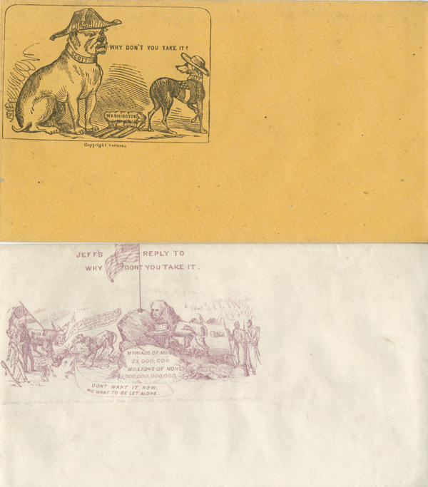 Image: In the top image, Winfield Scott is depicted as a bulldog who offers the skinny dog, representing Jefferson Davis, a side of beef labeled "Washington." The bottom envelope is Jefferson Davis's response, depicting him as a lion, standing on a boulder that says myriads of men and millions of money. Other emaciated animals are included in the scene, along with a battlefield in the background.