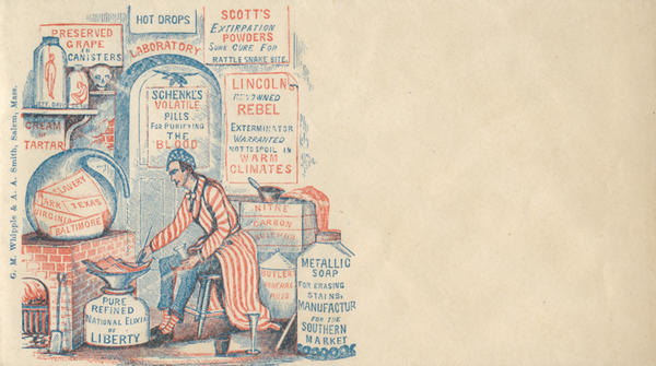 Image: Lincoln as an alchemist, wearing the red, white and blue of the Union, dips into the "Pure Refined National Elixir of Liberty" at his feet. Posters for other Union pharmaceutical remedies cover the walls.
