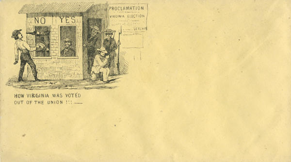 Image: A man holding a Union ticket at a polling station is intimidated to vote "Yes" in favor of Secession because of armed men working the booth.