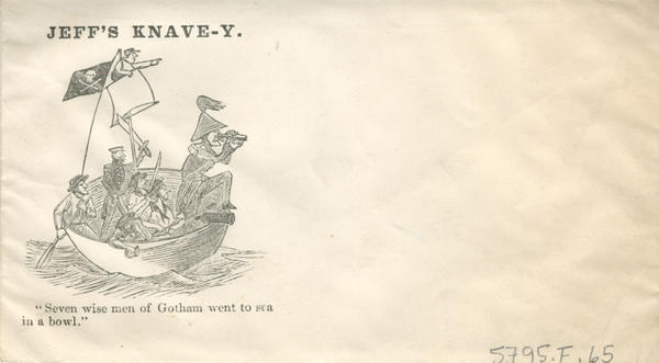 Image: Jefferson Davis, in military uniform, peers into binoculars while standing with one foot at the edge of a bowl that carries six other armed men at sea. A jolly roger flag is raised.