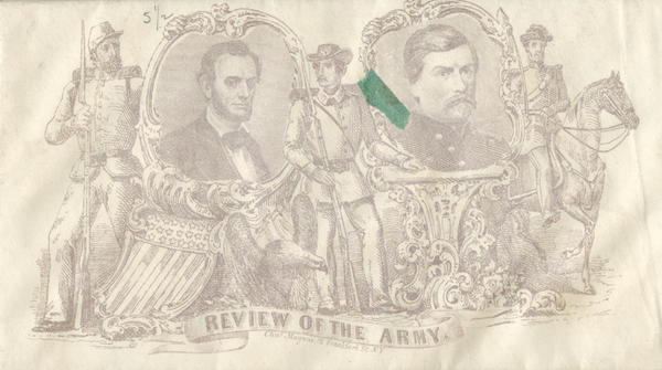 Image: Union soldiers stand with flags, cannons and shields around bust portraits of both Abraham Lincoln and George B. McClellan. The banner below the portraits reads: "Review of the Army".