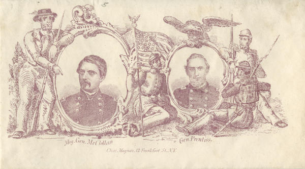 Image: Four Union soldiers flank the bust portraits of George McClellan and Benjamin Prentiss.