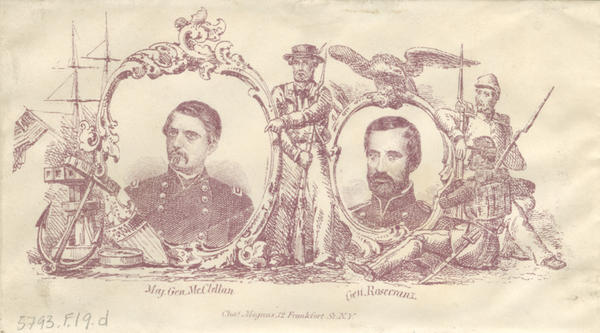 Image: Three Union soldiers flank the bust portraits of George McClellan and William Rosecrans. Includes an anchor and ship in the background.