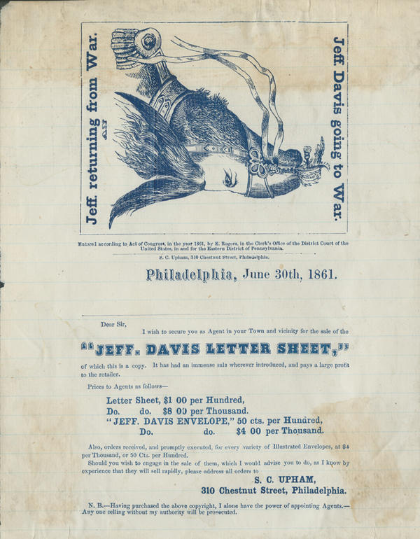 Image: This is an advertisement for stationery with the image of Jefferson Davis, President of the Confederacy, pre- and post-war. The image mocks Davis and he is seen first, going to war, in a military cap decorated with ribbons. If one turns the image upside down, Davis appears like a jackass, his face deep in a bag of oats. This stationery, according to the advertisement below the image, is identified as the "Jeff. Davis Letter Sheet." There were envelopes for sale to accompany it.