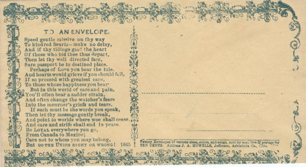 Verse 2475: To an Envelope. Speed gentle missive on thy way to kindred hearts--make no delay, And if thy tidings glad the heart of those who bid thee thus depart, Then let thy well directed face, Sure passport be to destined place. Perhaps of Love you bear the tale, And hearts would grieve if you should fail, If so proceed with greatest care, to those whose happiness you bear. But in this world of care and pain, You'll often bear a sadder strain, And often change the watcher's fears, into the mourner's griefs and tears. If such must be the words you speak, then let thy message gently break, And point to worlds where woe would cease, and care and strife shall end in peace. Be LOYAL everywhere you go, From Canada to Mexico; care not to whom you may belong. BUT GO TO THE UNION RIGHT OR WRONG! 1865