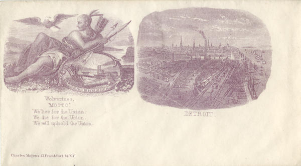 Image: On the left hand side of the envelope a Native American man sits on the ground and leans on "Enterprise" symbols. He holds a bow and arrow in his right hand, and more arrows in his left hand. An eagle hovers over him. On the right side of the envelope is a birds-eye view of the industrial city of Detriot.