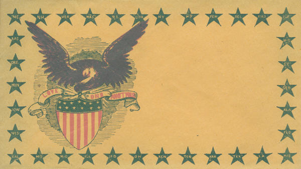 Image: An eagle flies above a shield decorated with the stars and stripes. The eagle grasps a banner in its mouth: "Love One Another." Blue stars with the initials of the states form a border around the envelope.