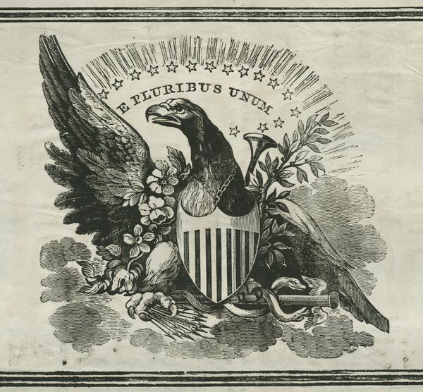 Recruiting poster illustration depicting "an eagle with a shield on a chain around his neck, beneath the motto: E. pluribus unum."