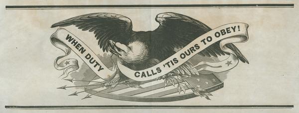 Recruiting poster illustration depicting "an eagle on a shield, with the banner: mottos vary." The motto on this poster reads: "When duty calls, 'tis ours to obey." Other examples include, "No compromise with traitors, and no argument but the cannon's mouth"; "The Union now and forever"; "Not for ourselves, but for our country." See woodcut15 for a similar image.