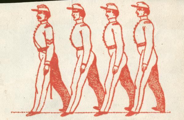 Recruiting poster illustration depicting "four soldiers marching in single file."