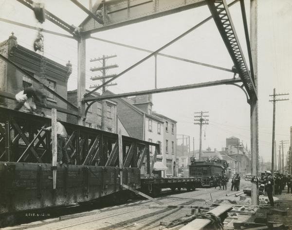 Street view looking north at steel bent 85 on North Front Street. Shows a locomotive pulling a freight car containing through Pratt trusses. A group of men stand on the sidewalk nearby. The signboard for M.F. Gates & Son coal yard is visible in the distance, which places this scene along the 1000 block of North Front Street. A small portion of Immaculate Conception Roman Catholic Church is visible as well.