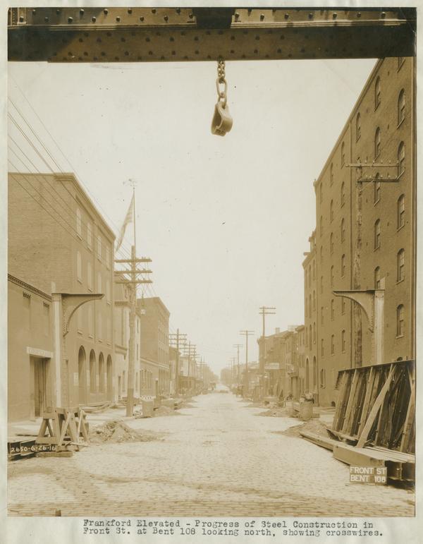 Progress of steel construction in Front St. at bent 108, looking north, showing crosswires, June 26, 1916.