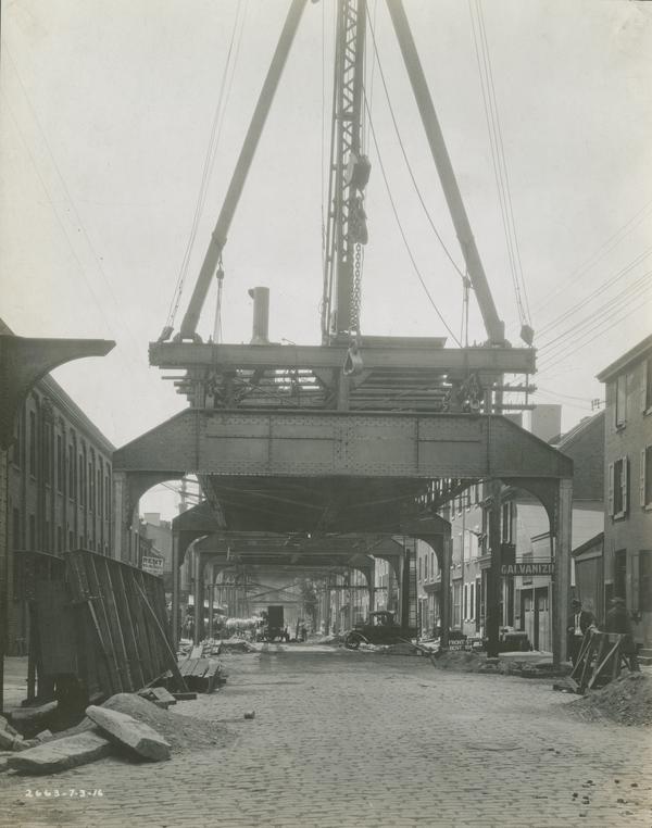 Progress of steel construction in Front St. at bent 108, looking south, July 3, 1916.