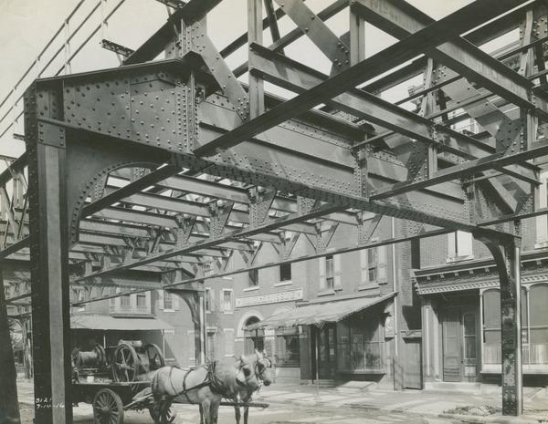Street view looking northeast at a transverse girder near bent 136 on the unfinished elevated track near the 1400 block of North Front Street. Two horses pull a cart carrying equipment. Includes the store front of Wm. Mulherin's Sons, a liquor store at 1355 North Front Street.