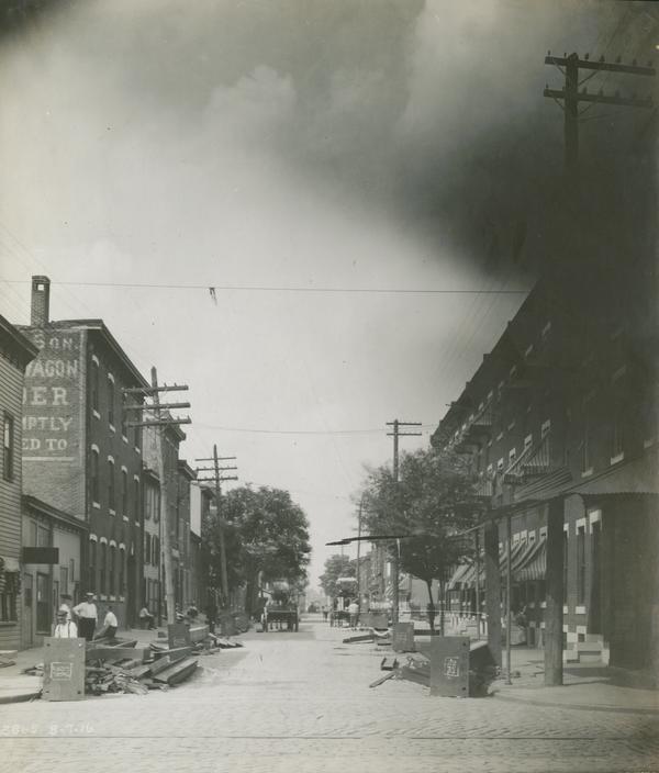 View looking north, showing construction materials flanking the cobblestone street. Includes horse-drawn carts and buggies and people sitting on front stoops of properties along North Front Street.